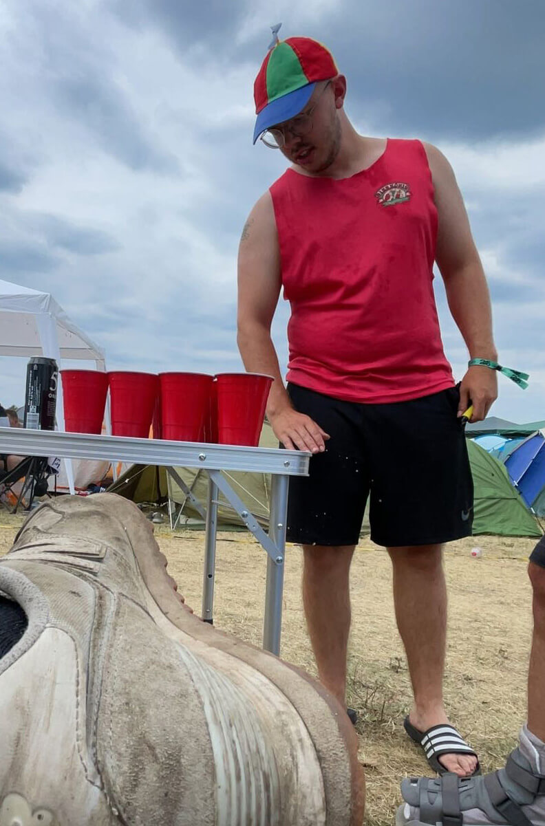 Seine Leidenschaft für Festivals ist ansteckend. Als wir 2023 zur OKF über den Campingplatz aufbrachen, waren wir voller Vorfreude auf Party, Freunde und unendliche Festivalmagie. Doch dann geschah etwas Unerwartetes - Danny stolperte über einen versteckten Bach und landete kopfüber in den kühlen Fluten.
